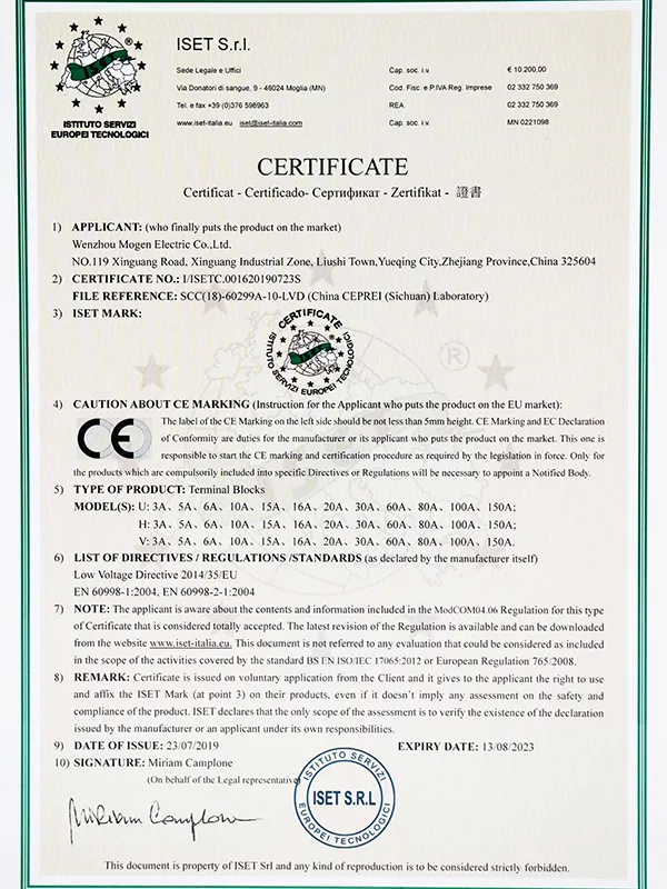 ООО Вэньчжоу Могэнь Электрик было основано в 1999 году. За более чем десятилетний период развития компания превратилась в комплексное промышленно-торговое предприятие, специализирующееся на проектировании, разработке и производстве различных типов клеммных колодок и соединителей. Мы обеспечиваем поддерживающийвысококачественную продукцию и услуги для различных отраслей, включая энергетику, телекоммуникации, машиностроение, строительство, нефтяную, химическую, авиационную, транспортную отрасли, железнодорожные перевозки, автомобилестроение, бытовую технику, механическое и электрооборудование.